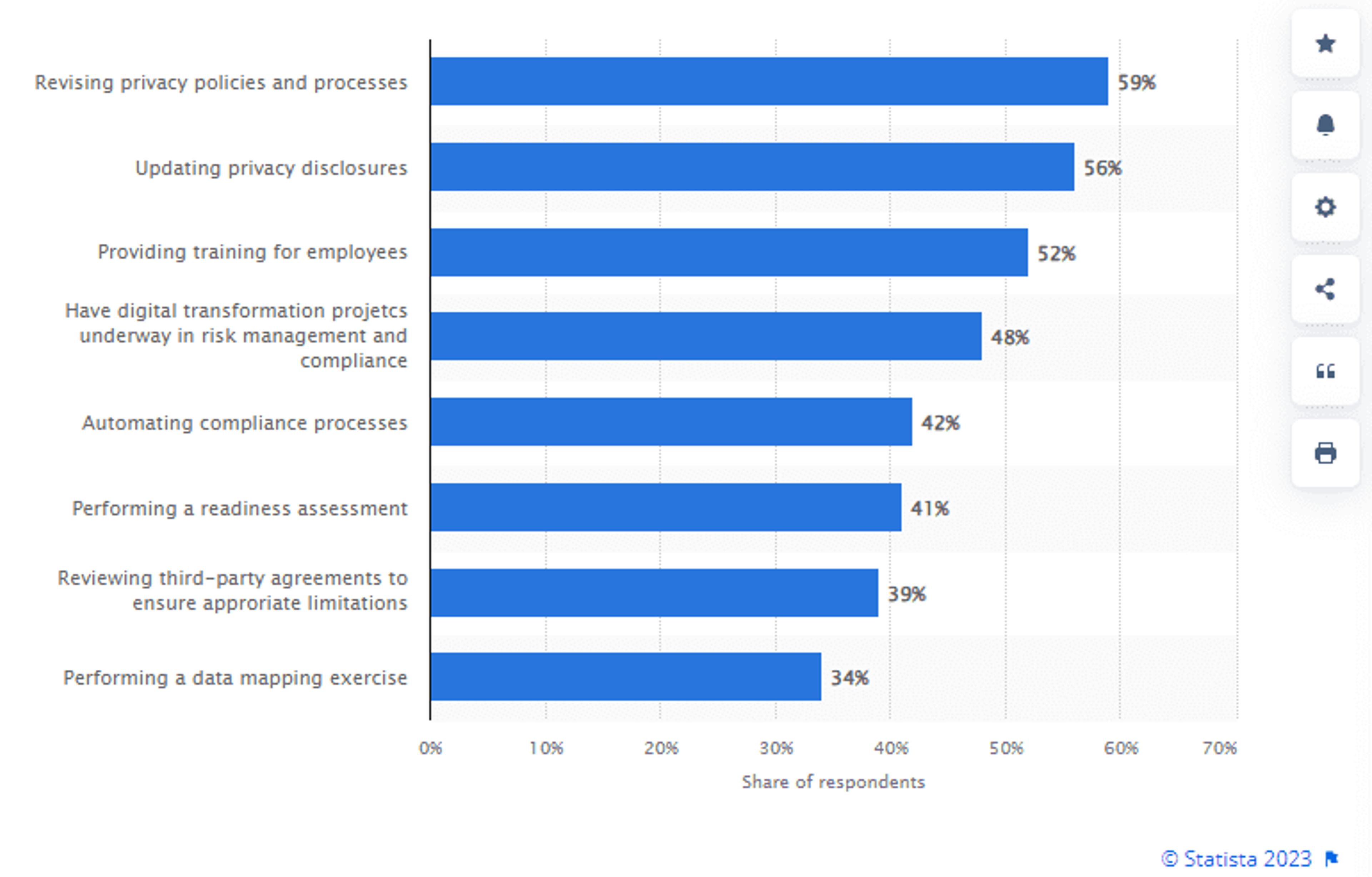 High-level data governance policies should also be designed with privacy as a top priority. According to Statista, updating policies and processes is the top action healthcare leaders are taking to better comply with data privacy regulations.