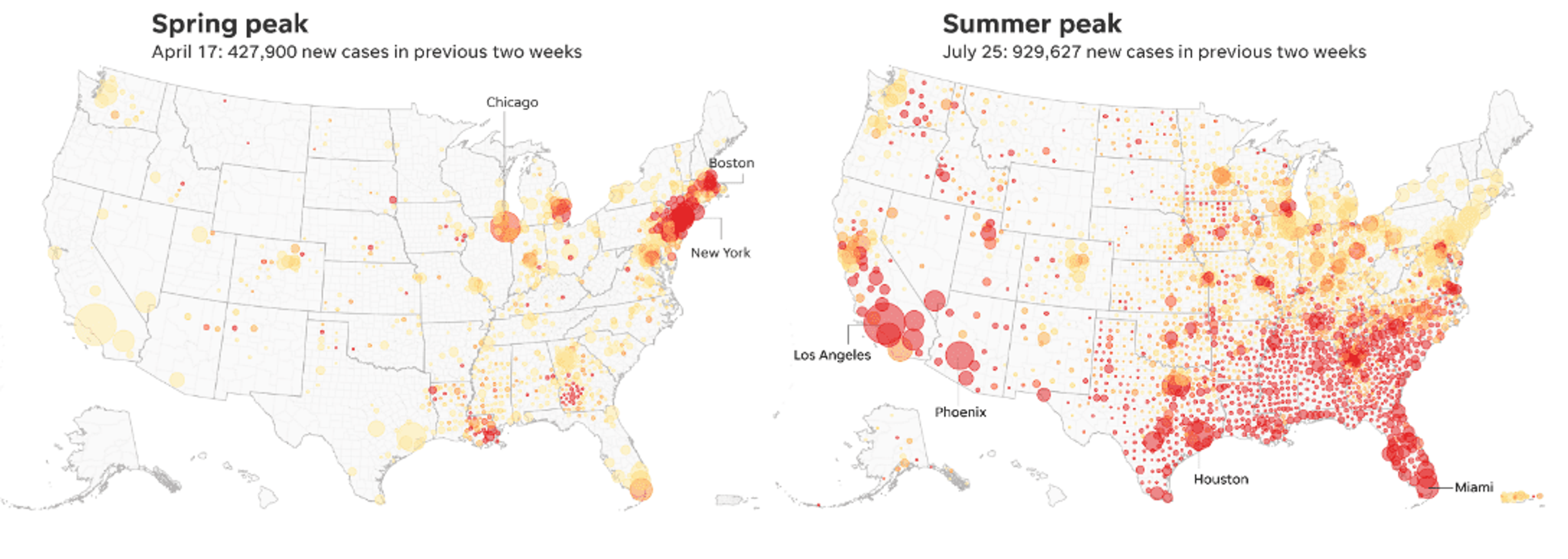 This application became more visible than ever during the COVID-19 pandemic, when heatmaps and other similar visuals were used to track COVID-19 spread and communicate it effectively with the public (the heatmaps below are from spring and summer 2020, during the initial spread of COVID).