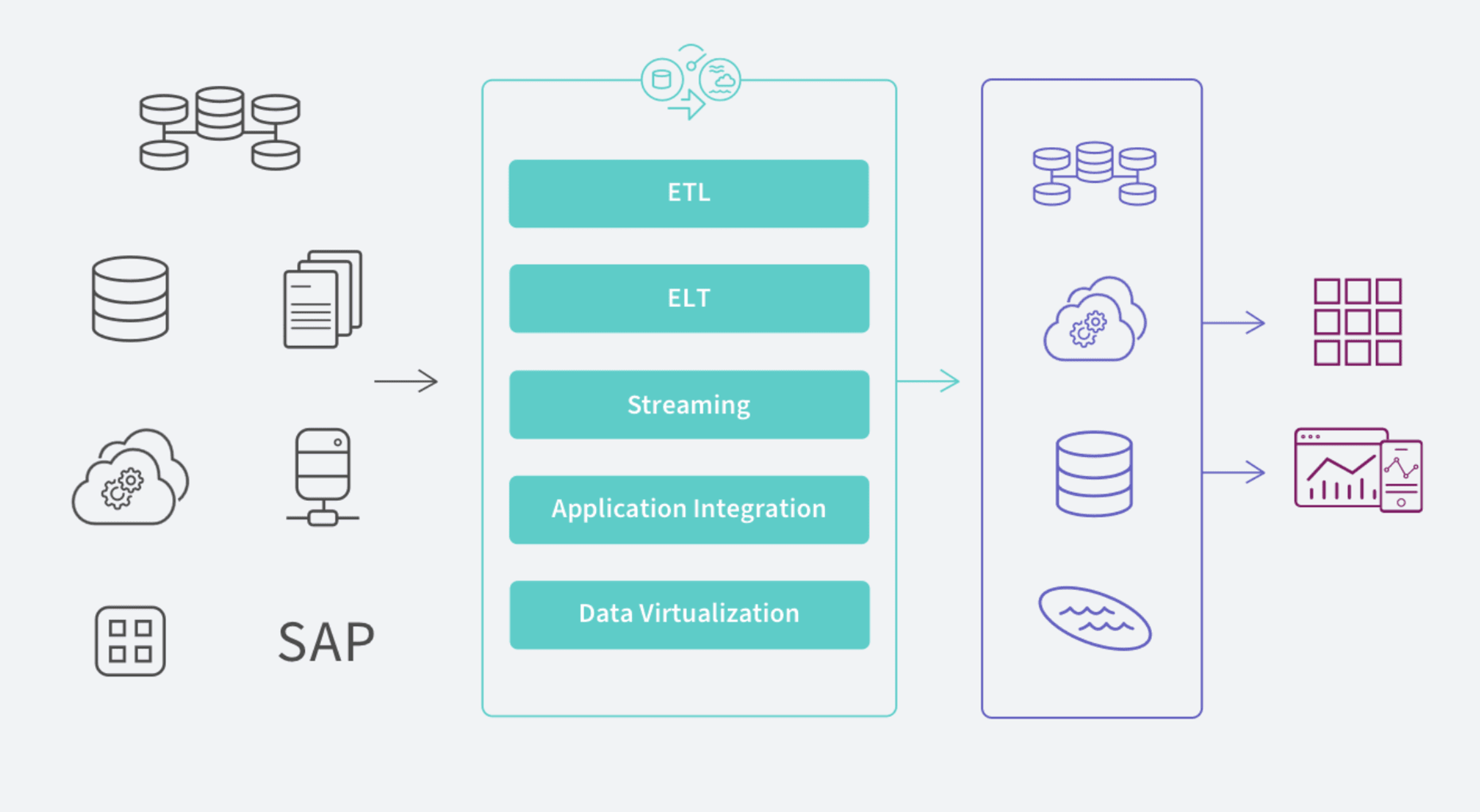 - Extract, Transform, Load (ETL): Extracts data from different sources into a staging application for transformation and then load it into a centralized repository, such as a data warehouse.
