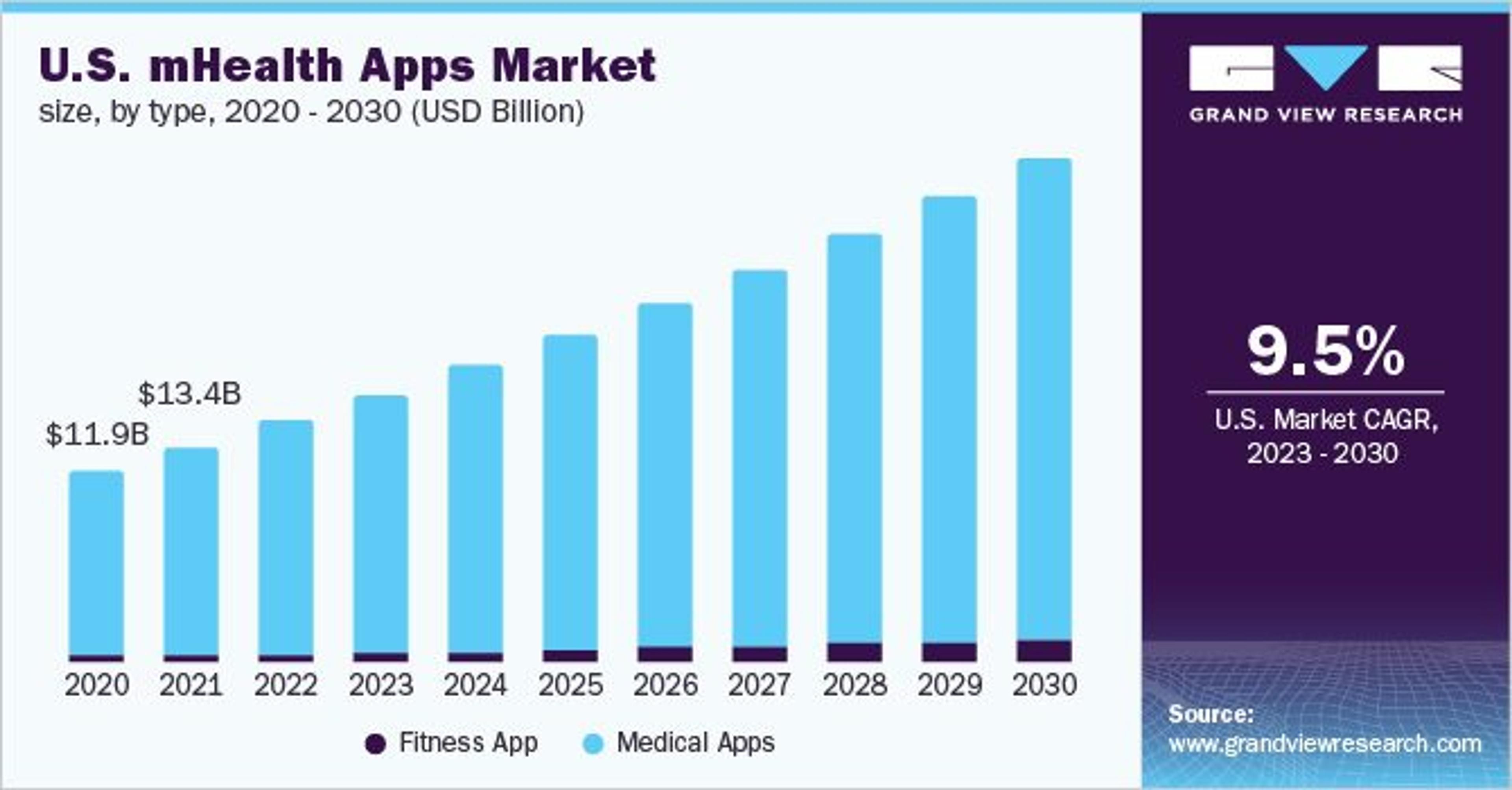 Research predicts that from now until at least 2030, mobile healthcare apps will grow at a compound growth rate (CAGR) of 11.6%Opens in a new tab, with tracking patient data one of their top use cases.