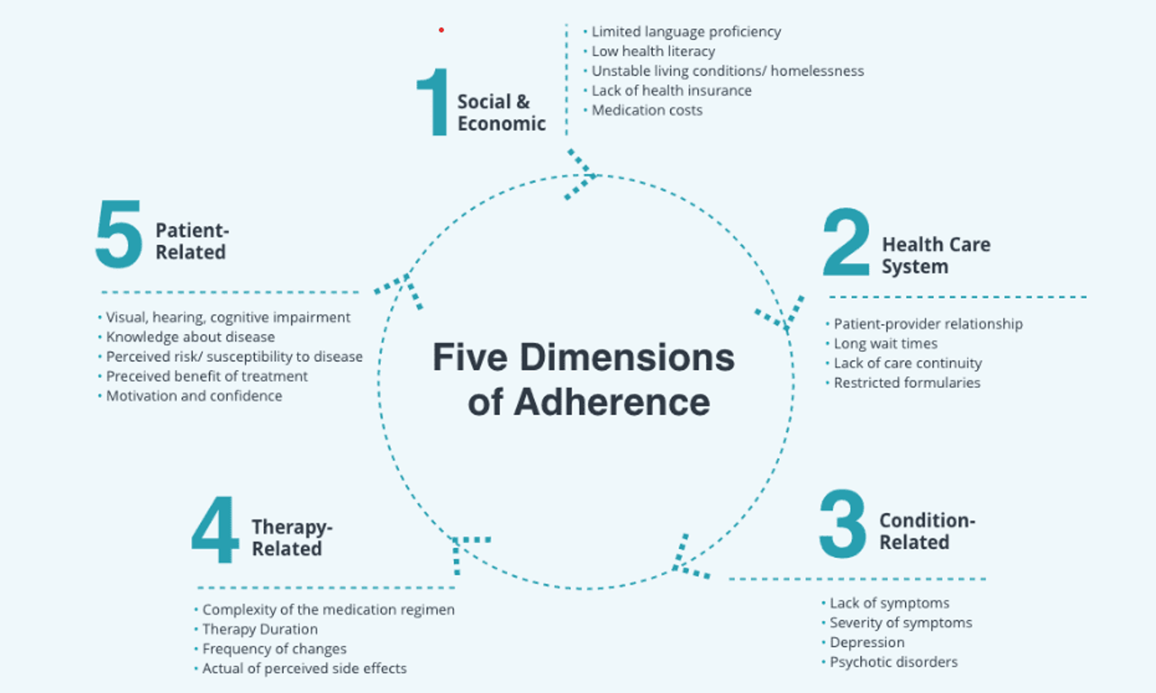 There are five dimensions to patient adherence that, collectively as a framework, can help providers evaluate a patient’s ability to stick to a treatment plan and help break down barriers when needed. They include:
